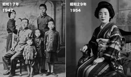 写真(上)は昭和17年に満州で撮影された家族写真。又、その右は昭和29年某写真館で撮影されたものだ。この写真の女性(記念に地髪を結って撮影したもの)に父が何度も何度も通い詰めたという話を聞いて、吹き出した事を思い出した。・・・あの苦虫を潰したような怖い顔をしている父の鼻の下は、当時どれくらい伸びきっていたのだろうか。