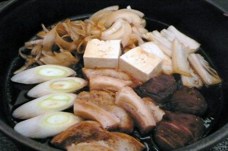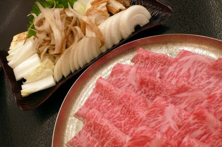 その日の牛肉の中から最高の物を仕入れるという同店。どれどれ、今日は「栃木産A-5」の極上霜降り肉が運ばれて来たではないか。・・・鉄製のすき焼き鍋に油が敷かれ、その極上肉がジュジュジュッと割り下と共に鉄鍋の上で踊り始める。