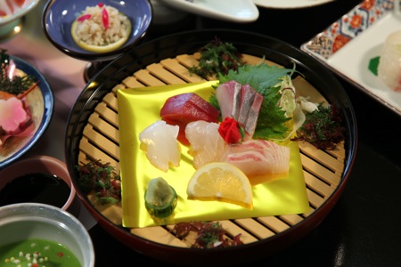 金箔の上に地魚が五種。山葵をちょっとトッピングして甘露醤油を付けて食べると、お酒も忘れて白ご飯を食べたくなる。流石に天草の新鮮な刺身だ。