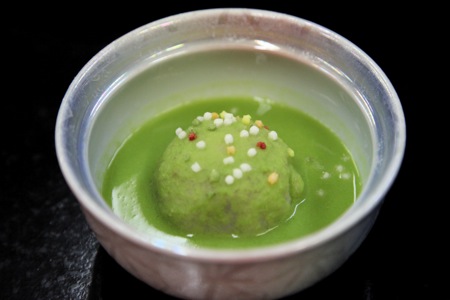 あっさり、まったり。グリンピースの色鮮やかさが春の訪れを知らせてくれる。見た目に・・・新緑色に染まった小高い丘に、野草がぽつんぽつんを咲き始めたイメージである。