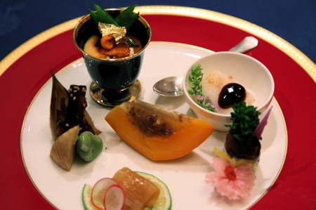 今回は前菜から全く異なるメニューのようだ。旬の食材をさらり皿の上に踊らせているところなど、実に憎いほどの演出。・・・最初にひらひらと動く金箔に眼が行ってしまった。