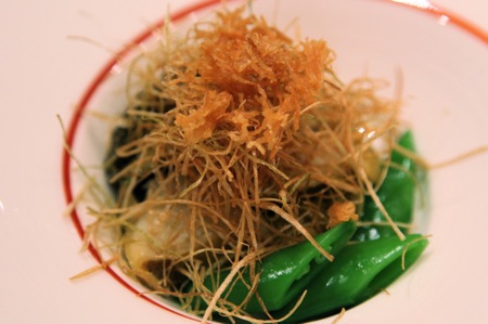 いつもは乾燥アワビが出るところを、今日は敢えて活アワビを柔らかく調理してあった。肝ソースがアワビの下にペースト状に敷かれており、アワビの身に絡ませて食すと、あまりの美味しさに絶句してしまった。