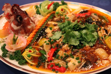 この赤ハタの四川辛し煮込みは、お祝い用に最適の料理のようだ。見た目も鮮やかに、色とりどりの食材が敷き詰められ、その上に香菜(シアンツァイ)がある。
