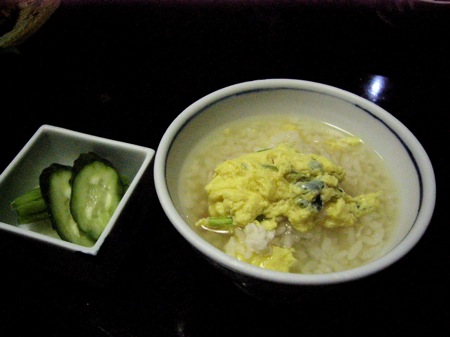 蟹や野菜の出汁でおじやを作る。そこに卵を落とすが・・・これまた、最後のデザート前の仕上げに最高である。
