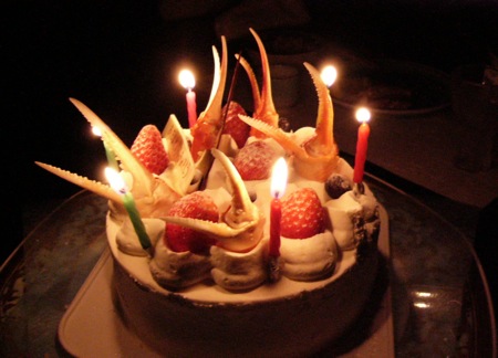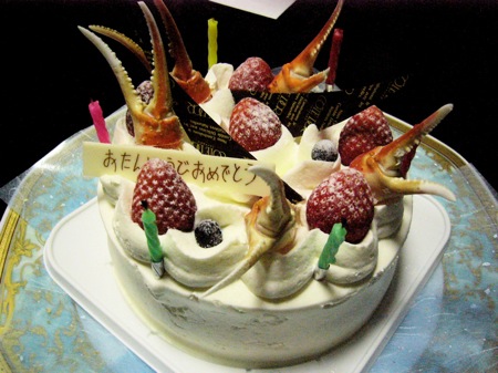 何とも蟹の爪が立った誕生ケーキ。実は筆者のアイデアだったが、同店は嫌な顔一つもせず、立派でユニークなものを出してくれた。・・・大感謝!
