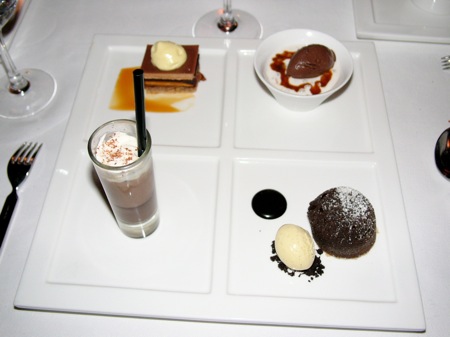 同レストランは、最後のデザートのスイーツが実にいい。真四角な白いプレートが4分割。丁度、漢字の「田」の字になっているところに、4種類のスイーツや飲み物が付いて来る。これは女性には見逃せないエンディング・セレモニーだ!