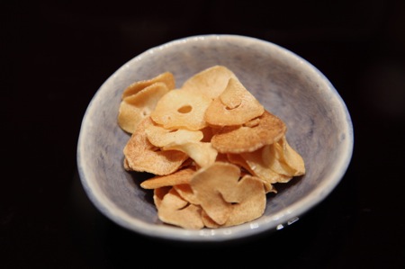上野シェフはスライスしたニンニクを鉄板の上で焼き始めたが、アミューズとして甘みのあるホタルイカのマリネが準備されているようだ。