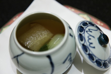 幻の茸と言われる衣笠茸が浮かび、底に眠っているのがフカヒレの姿である。スープは絶妙な味わいで、周囲を見回して器ごと呑みたくなった。