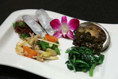 ■玄界灘産鮑の姿蒸し 肝ソースあえ/有明海産あげまき貝のX・O醤炒め
