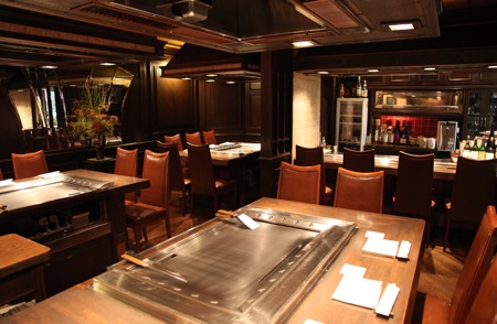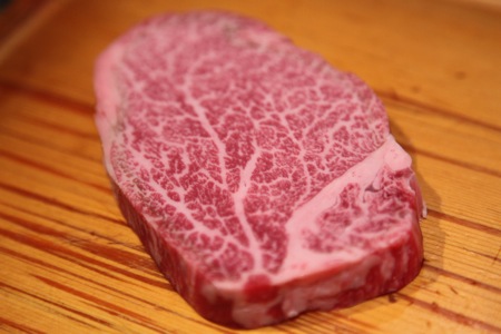 今回食すのは、熊本県産の黒毛和牛と赤毛和牛だ。A5の黒毛のさしはなかなかのもの。吉本シェフが筆者の正面で焼き始めた。