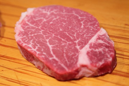 次は熊本県産の赤毛和牛の肉だ。さしが少なく(これは赤毛にしてはさしが多い)、身がかなり柔らかそうである。