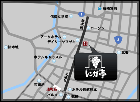 同レストランは下の地図の通り熊本市内中心部にある。筆者のサテライトオフィスからも徒歩5分で行ける近さだ。