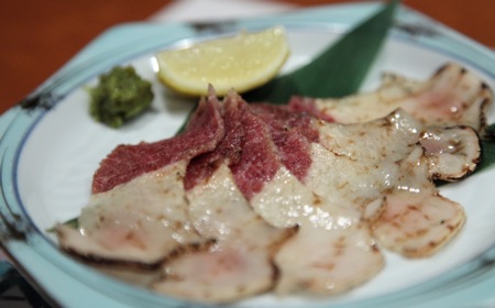 ベーコンに加工する前の「畝須」。柔らかく、嫌な脂の味が全くない極上のものである。同店の人気メニューのようだ。