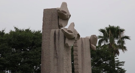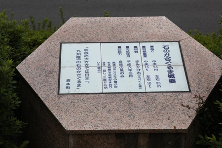 熊本県山鹿市(旧鹿本町)にある「石のかざぐるま」。高さ5.5 m、材質は赤みかげ石(スペイン産)で、羽根の大きさでは日本一 、九州唯一の石のかざぐるま。何と、風速3m(ススキの穂が揺れ る程度の風)でこの大きな石の羽根が回ります。