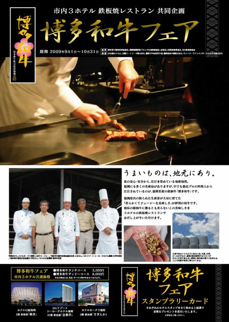 今回のフェアでは、3ホテルの鉄板焼レストランでのコースが格安(博多和牛コース 3,500円・博多和牛ディナーコース 8,000円/税サ含む)に統一されており、消費者にとって気兼ねなく足を運べるお得なフェアである。