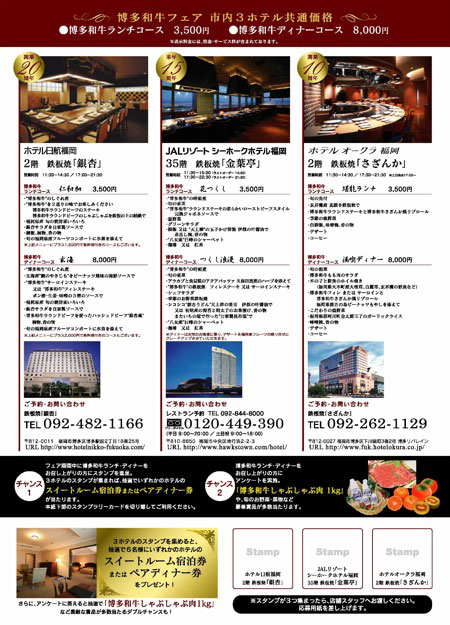 チラシ(以下からPDFファイルをダウンロード可)のように、同フェア期間中に3ホテルの鉄板焼レストランを食べ歩き、3カ所のレストランからスタンプをもらえば、いずれかのホテルのスイートルーム宿泊券又はペアディナー券が、更に、アンケートに答えると「博多和牛しゃぶしゃぶ肉 1kg」、旬の野菜や果物など豪華賞品が当たる。