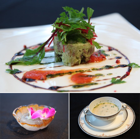 ◎秋刀魚とアヴォカドのセルクル仕立て 完熟トマトのクーリと熟成バルサミコ酢の香りで/ムール貝入り豆乳のポタージュ マリニエール風