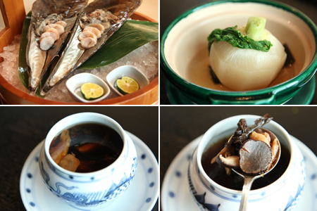 写真は上から、希少価値「対馬産」タイラギ貝の素焼 自家製昆布塩で、蕪とタラバ蟹の温かい卵豆腐と春菊のしゃぶしゃぶ、蔵王地鶏の生ハムとドライ木の子の「壺蒸し」コンソメ トリュフの香りである。