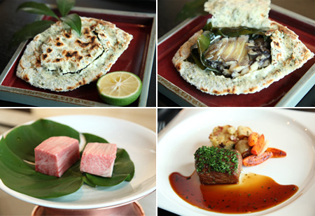 次の写真は、三陸産の蝦夷アワビの 岩塩包み焼き 磯の香り、極上「博多和牛」のラウンドビーフのロースト 金葉亭風、