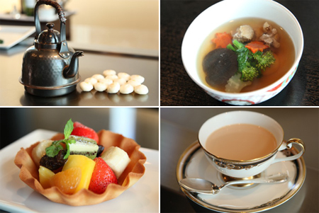 最後の写真は、鉄板で作る「焼き餅」茶漬け、トロピカルフルーツ彩々のチョコレートフォンデュー、甘〜い香りのロイヤルミルクティーである。