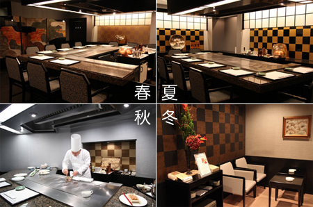 「春」のカウンターには屏風と壺と淡い市松模様。「夏」はくっきりした市松模様と大皿。「秋」はちょっと寂しい色合いの市松模様。そして「冬」は暗めの市松模様。それぞれ好みによって予約すると、鉄板焼の味わいも変わって面白そうだ。
