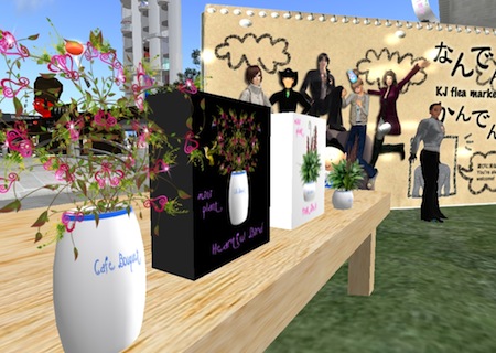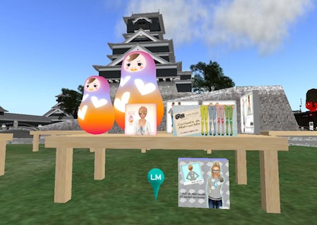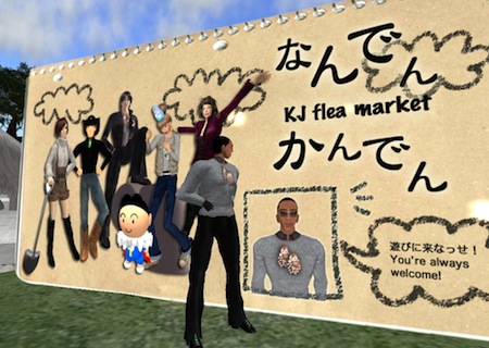 KUMAMOTO JAPAN FLEA MARKET(仮想現実世界セカンドライフの熊本ジャパンSIM)に大きな看板が立っている。主力メンバーの元気な姿や妙にかしこまった私の写真が貼付けてあった。^^