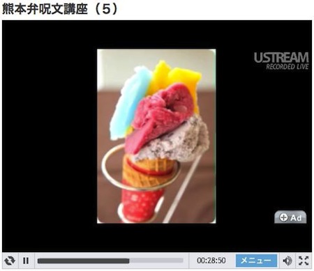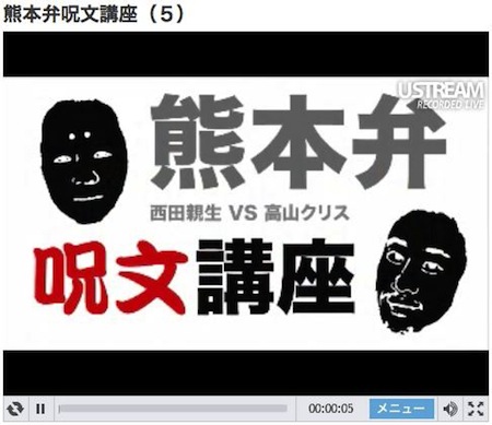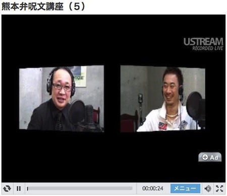 昨夜、午後8時から第5回「熊本弁呪文講座」が放送された。まだまだUSTREAM自体の知名度が熊本では低いが、全国各地からの視聴者のご支援やご協力で、楽しい番組展開ができつつあるようだ。