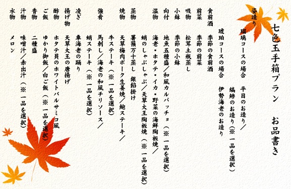 9月からの新しいメニュー「七色玉手箱(なないろたまてばこ)/(R)松島観光ホテル岬亭」は、左品書きの通り。何と2ヶ月に一度替わるという「七色玉手箱」は、メニューの中の7品目はお客様が自由に選べるという、すこぶる親切で料理長の心のこもったメニューである。