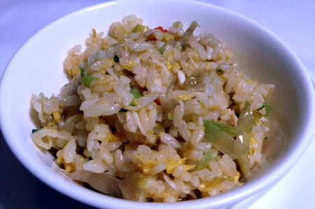 贅沢にタラバガニの入ったチャーハン。ジューシーな蟹汁が米粒の一粒一粒を包み込んでいる。レタスの食感と相まって、最高に仕上がっているチャーハンだ。