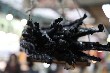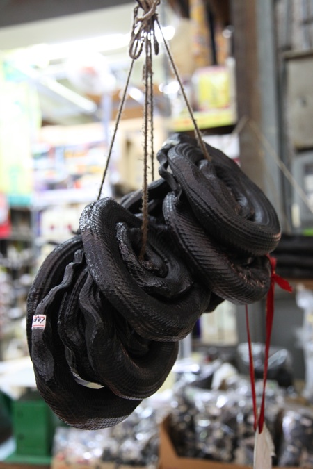 イラブー、発見!!ウミヘビで猛毒を持つイラブーの薫製が吊ってある。「あ〜、昨日食べたのがこれだったのか?」と、ちょいと腰を引き気味の筆者であった。
