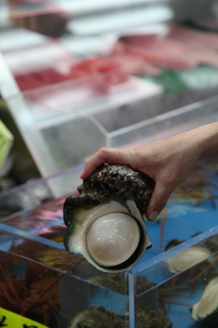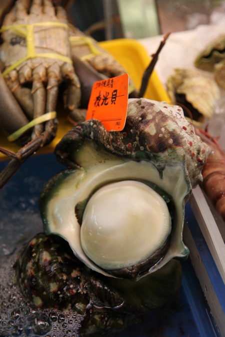 どでかい「夜光貝」だ。人の手で持ってみれば、その大きさが分かる。沖縄らしい海の幸をチョイスして、食堂で調理してもらったら美味しかろう!・・・まだ昼食で満腹のお腹をジャンプしてまで食べてみようかと、気持ちが揺るがされてしまった。^^