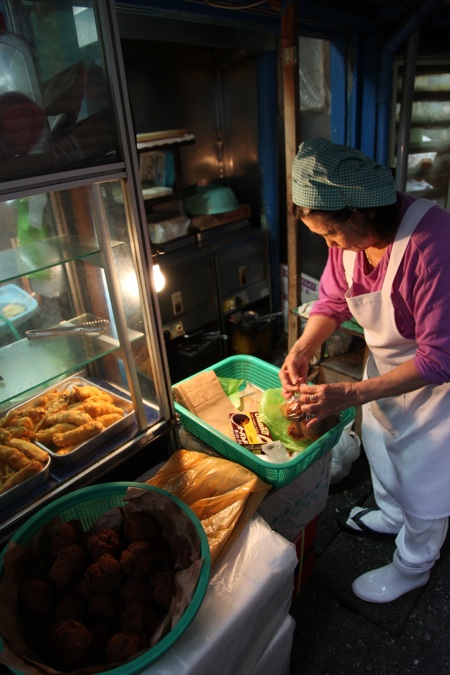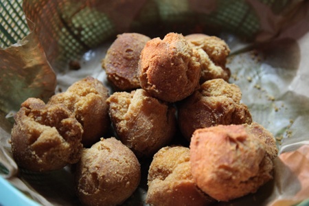 この路地裏に入ったところの店の「サーターアンダギー」は、これはこれは逸品だ。公設市場のメイン通路のそれより、かなり大きいが外側のサクサク感がたまらない。ちゃんと中まで揚げてある職人技の「サーターアンダギー」。