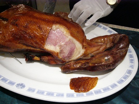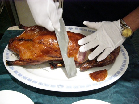 料理人が皿の上に1羽のダックを持って来て、さっそく食事の準備。眼前で見せる包丁裁き。国内の高級中華料理店より若干厚めに削いでいるような気がした。