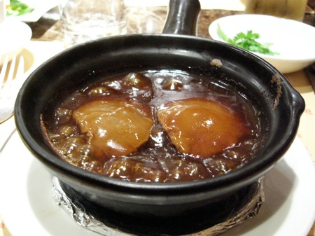 上写真は、熊本ホテルキャッスルの四川料理・桃花源の「乾燥アワビのステーキ」である。それに対して下写真は、海外で人から薦められた「乾燥アワビもどき生アワビの柔らか煮込み」。