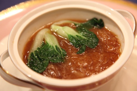 このフカヒレの煮込みは、フロリダ産の極上もの。コラーゲンバリバリの逸品である。通常のフカヒレと比べ若干色が濃く、風味も異なる。・・・黙って食べていると唇がくっ付くほどの濃厚さである。途中から赤酢や黒酢などを加え、色んな味にアレンジして楽しむ事ができる。