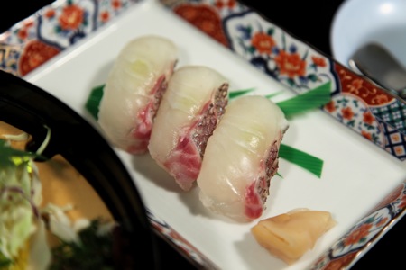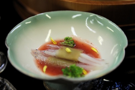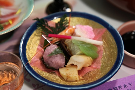 松島観光ホテルホテル岬亭の人気料理「七色玉手箱」。何と言っても伊勢エビのお造りは、琥珀コースでもメインディッシュの一つである。
