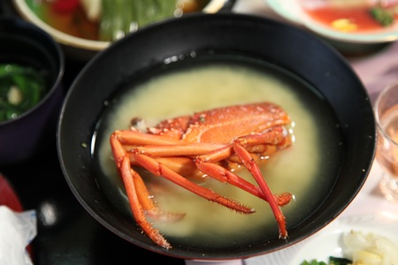 つるりんと甘く歯切れの良い伊勢エビが喉を通って行く。いやあ、これは至福の極みだ。食べ終わると、以下の写真のようにみそ汁に真っ赤に姿を変えてサーブされてくるのだ。