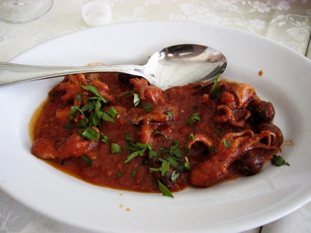 これはこれは、大きさはイイダコくらいの小さな蛸とトマトベースのソースだ。少々ピリ辛ってところだが、香草が程よい風味を出している。