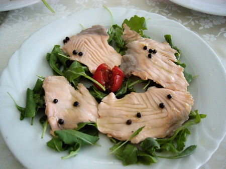 次はサーモンのようだが、小さく真っ赤なトマトが中央に1つ。お花を真上からみたような飾り付けなのか、ちょっと可愛さとほんのり田舎の香りを運んでくれた。