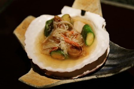 1本で120グラムもあるジャンボアスパラは店内に何気に飾ってあったのだが、それを見て注文するお客も多いという。ホタテは旨味のかたまりでもあり、それに絡み付いたフカヒレと蟹の食感と濃厚な味は至福の極み。つい、だし汁まで飲み干してしまった。