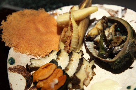 さてさて、次の料理の食材として眼前に出されたものは何と特大の「蝦夷鮑」。なかなか入手できないほどの珍味だが、これがどんな料理に変身するかは、次回ブログでご覧頂きたい。