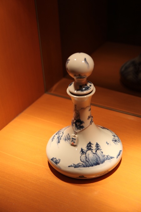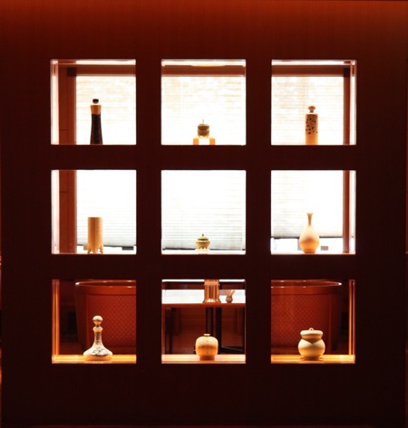 ホテルオークラ福岡・鉄板焼「さざんか」の通路突き当たりにあるガラス格子・・・と思いきや、覗き込むと・・・陶磁器ファンは必ず足を止めてしまうほどの有田焼等が、何気にオブジェとして飾ってある。実に、素敵だ!