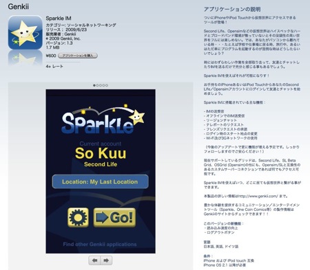 ちょうどパソコンからセカンドライフ・熊本ジャパンのキャンプリセットや主力メンバーと話をしていた矢先の事。たまたまiTunes Storeで「セカンドライフ」で検索をしたのだが、「Sparkle IM」という凄いアプリが抽出された。
