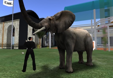 下写真は粘土細工のような「スカルプティッド」で作られた象であるが、実に良く出来た作品の一つ。海外のクリエイターによって作られた物で、定期的に鼻が動きリアル感を出している。また、象の頭に乗ると実際に乗ったような動きをアバターに与えられる仕組みだ。
