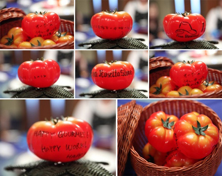 約2時間の豪華ランチを終え、合同写真を撮ることになったのだが・・・そこで皆から贈られた「遅ればせながらのバースデイプレゼント」。一人一人がトマトの置物にメッセージを寄せ書きしたものを差し出したのである。