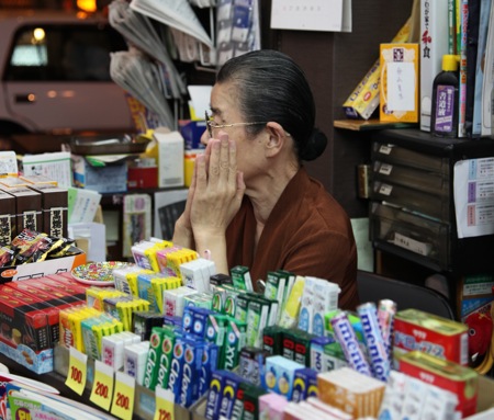 ◎時折、舗道を歩く人の流れを見ているスズコさん。