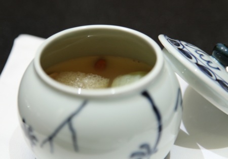 ◎ふかひれの姿入り衣笠茸と干し貝柱の蒸しスープ