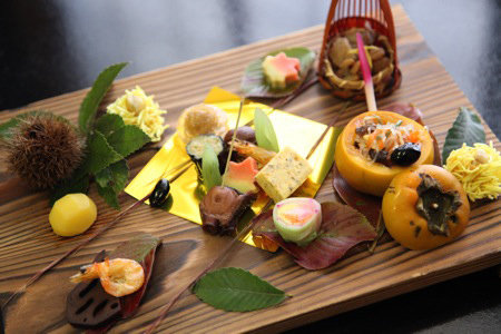先ず、「秋の吹き寄せ」は見るだけで楽しくもあり、秋一色を表現した作品である。ファミリーのお客であれば、子供たちが一つ一つの食材を手に取りながらワイワイ飛び回って騒ぎそうなサプライズである。