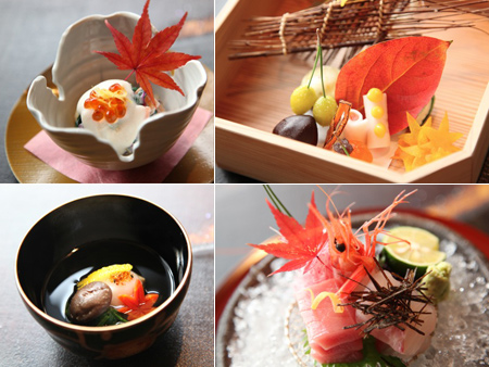 ◆前 菜 松葉かに笹巻小袖すし 餅鯨みそ漬け 千枚蕪サーモン巻き べっ甲玉子柿見立て 栗丸十 衣かつぎチーズ焼き 松葉くち子 紅葉チップ