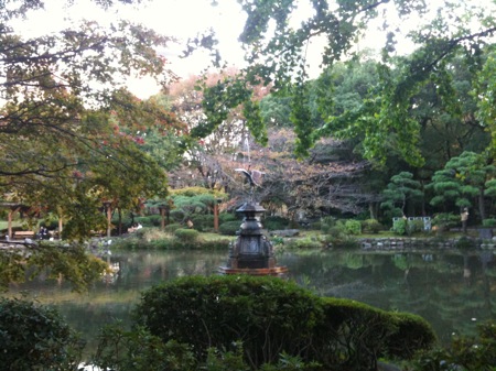 食事後ミーティングを行い、午後から目の前の日比谷公園散策へ。名物の噴水を通り、霞ヶ関方面を眺め、カレー等リー ズナブルなレストランで知られる松本楼をすぎ反時計回りに公園を一周。自転車で通り過ぎる人もいて、公園のあちこちででは少しずつラブラブなカップルが集まって来たようだ 。